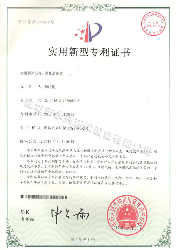 緩釋消毒器實(shí)用新型專(zhuān)利證書(shū)--詳情說(shuō)明