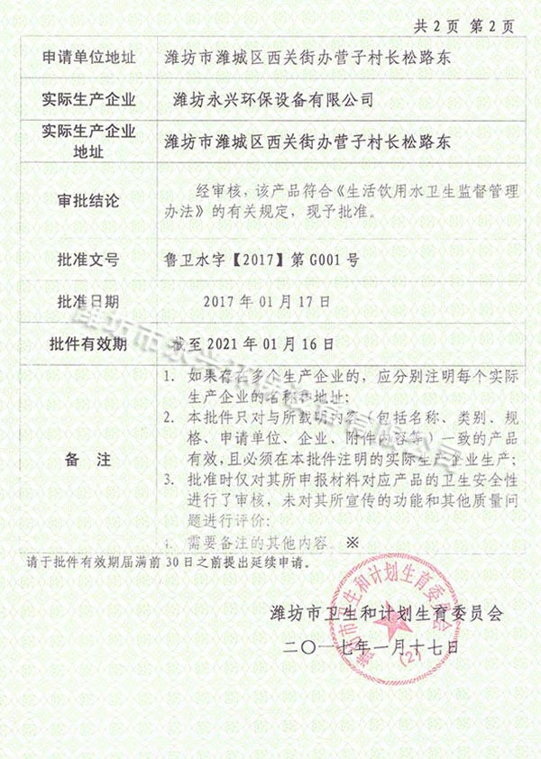 電解法二氧化氯發生器涉及飲用水衛生許可批件.